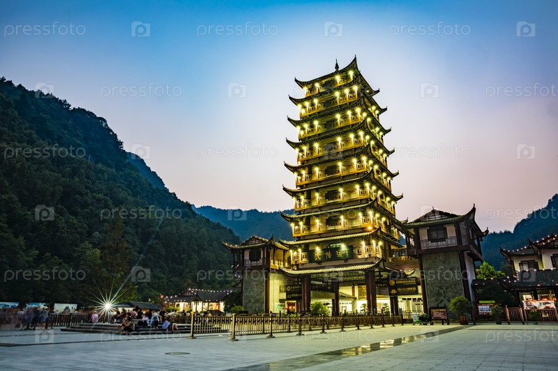 Подсвеченная китайская пагода у входа в парк Чжанцзяцзе на фоне гор в сумерках