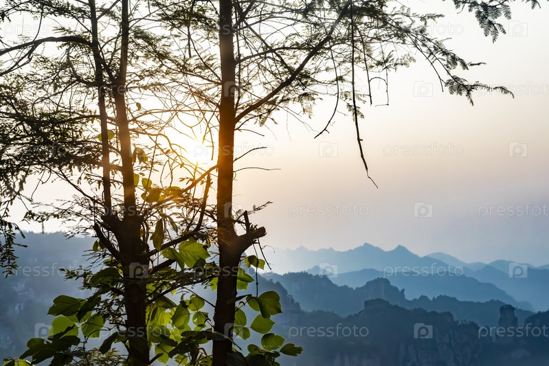 Восход солнца над туманными горными хребтами через силуэты деревьев