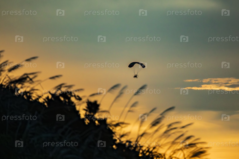 Параплан в небе на закате над холмом с травой