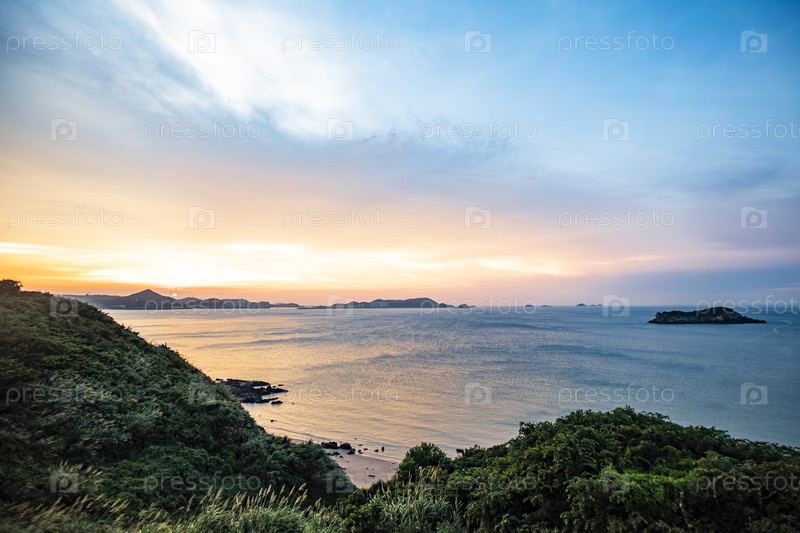 Морской залив на Шэнси с островами и зеленым побережьем на закате