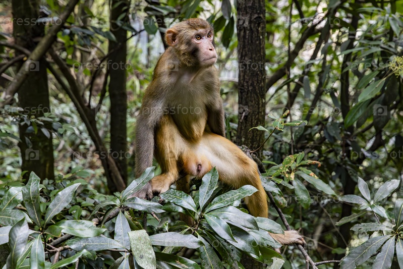 Макака на ветке дерева среди зеленой листвы