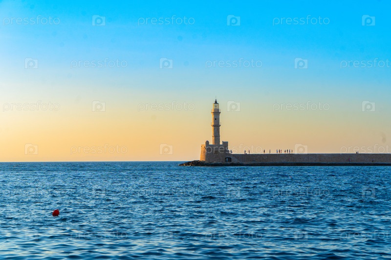 Залив Хании с морем и маяком на солнечном летнем закате, Крит, Греция, формат веб-баннера