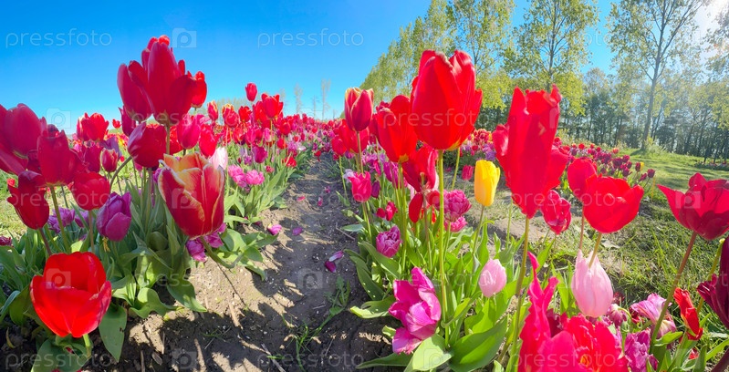 Знаменитое голландское многоцветное поле тюльпанов с рядами в солнечный день с голубым небом
