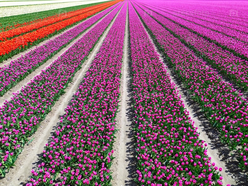 Знаменитое голландское поле тюльпанов с рядами в солнечный день с голубым небом fom над ним