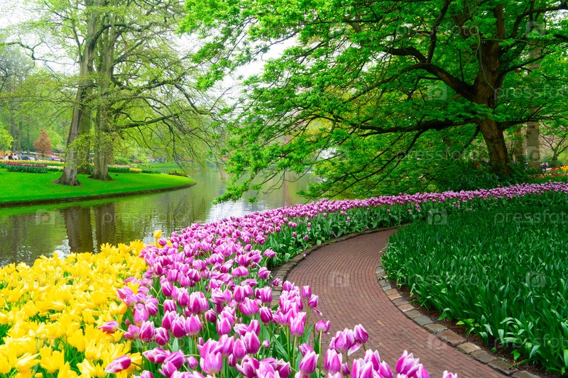 Красочный источник с чистой водой в саду тюльпанов, демонстрирующий яркие цветы в пышной обстановке и приглашающий посетителей исследовать