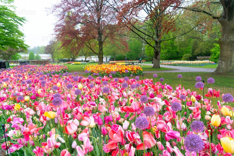 Путь через яркий сад тюльпанов в полном цветении во время восхитительного весеннего сезона захватывает дух