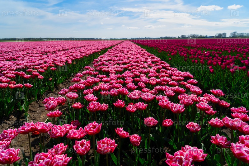 Знаменитое голландское темно-розовое поле тюльпанов с рядами в солнечный день с голубым небом
