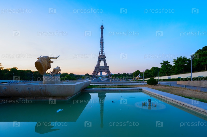 Эйфелева башня и сад Трокадеро на закате в Париже, Франция.Эйфелевая башня - одна из самых знаковых достопримечательностей Парижа