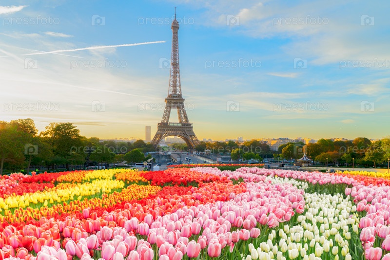 Эйфелева башня из садов Трокадеро при весеннем восходе солнца, Париж Франция, ретро-тон