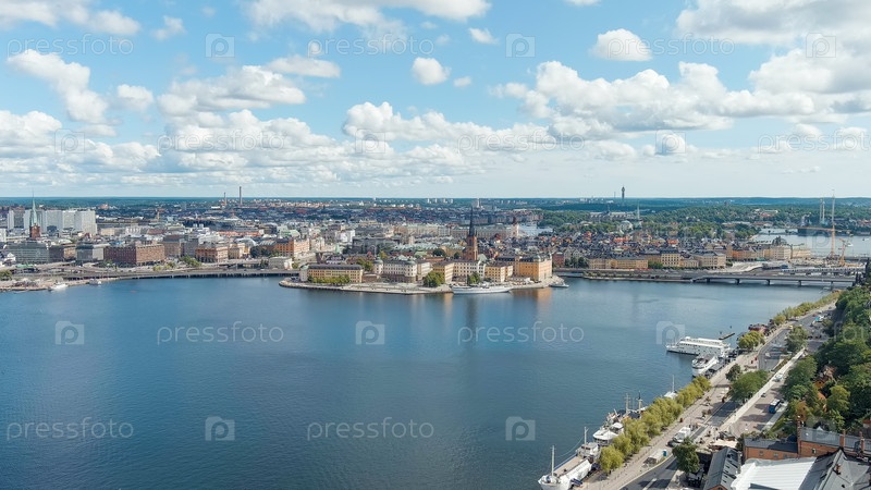 Стокгольм, Швеция. Остров Риддархольмен и озеро Маларен. Церковь Риддархольмена. Панорама города. Летний день, взгляд с воздуха