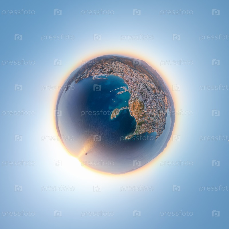 Кусадаси, Турция - 4 июля 2025 года: 360-градусный аэропанорамный закат астероида. Эффект маленькой планеты с круизным лайнером, островом, горой, мариной