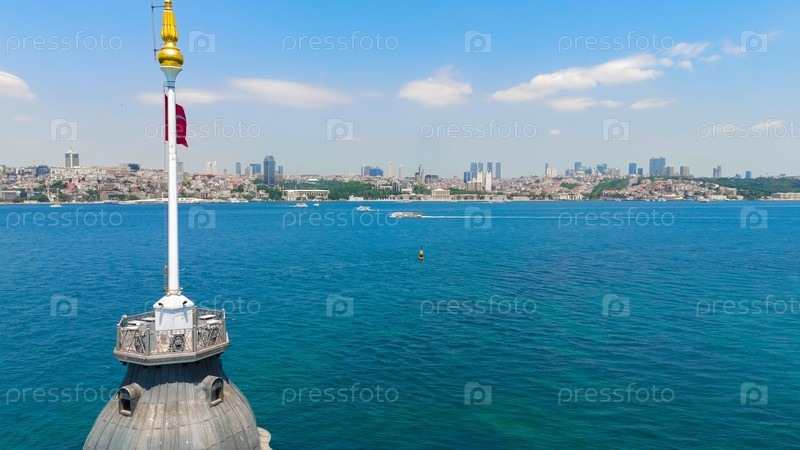 Европейский берег Босфорского пролива с пассажирскими паромами и водными такси, плавающими в ясный солнечный день