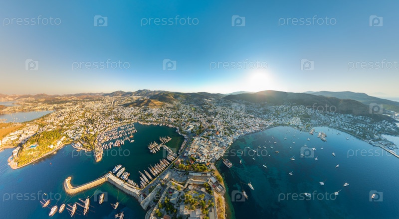 Бодрум, Турция.Утренний панорамный вид на залив с яхтами, мариной, бодрумским замком, белыми домами и пляжами в чистом утреннем свете