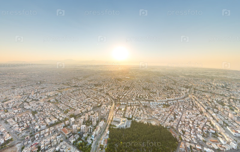 Панорама из воздуха современного жилого района, демонстрирующая упорядоченные сетки улиц, геометрические планировки зданий и обширный горизонт под утренним летним светом