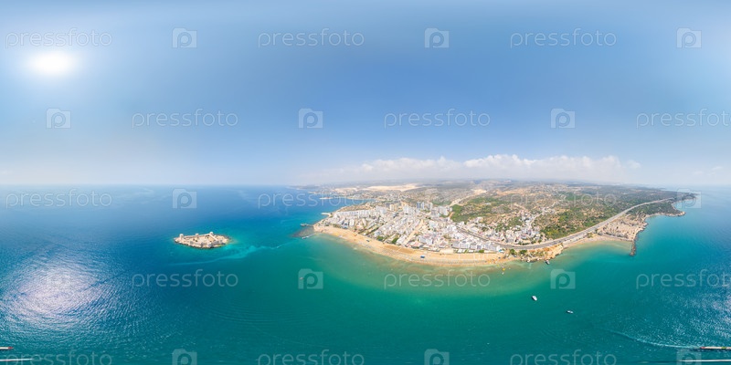 Кизкалеси, Мерсин, Турция. сферическая панорама с уровня моря между островом крепости Девственный замок и переполненным береговым побережьем фиолетовой воды, городом и горами вокруг Панорама 360x180