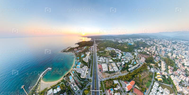 Авсаллар, Аланья, Турция. широкий панорамный закат с видом на шоссе D400, прибрежный город с курортными отелями, песчаными пляжами и Средиземным заливом, солнце в кадре. вид из воздуха