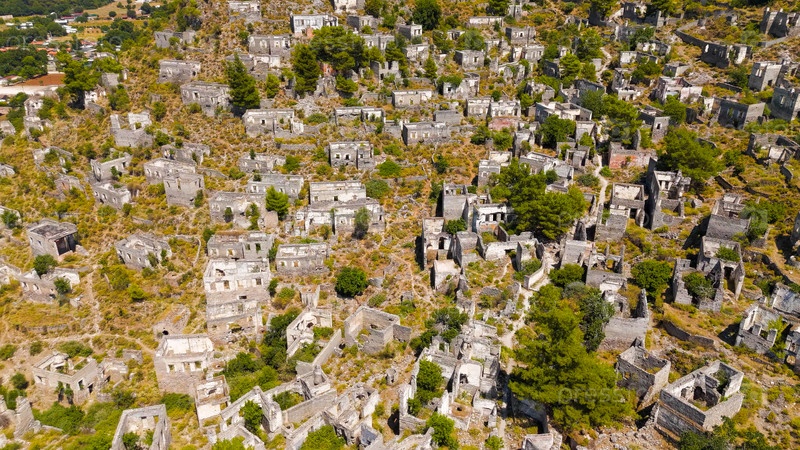 Каякой, Турция. воздушные снимки беспилотных летательных аппаратов древних руин городов-призраков и каменных домов на склонах гор, концепции туризма и исследования
