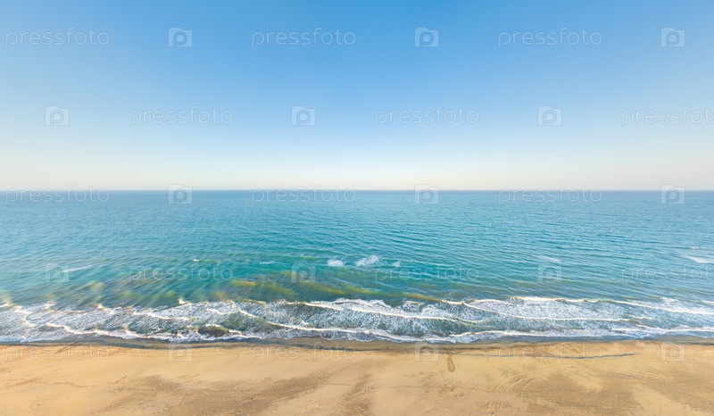 Минималистский взгляд с воздуха на пляж Патара с уравновешенным голубым небом, морем и песком летом утром, чистый геометрический состав