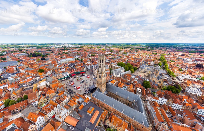 Брюгге, Бельгия. Белфорт. Центр города. Жилые районы. Панорама на город. Летний день, облачная погода. Вид с воздуха