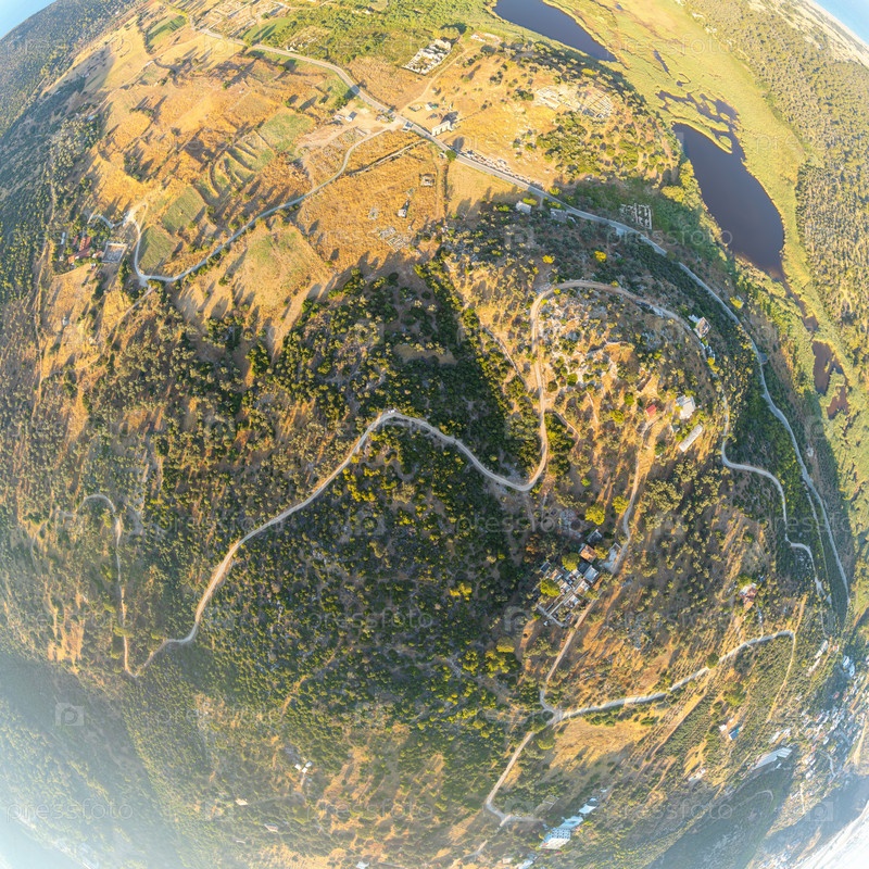 Гелемис, Турция.Взгляд сверху вниз из воздуха на планировку древнего города Патара, дорога доступа, извивающаяся по горной местности летом