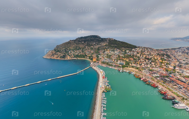 Посмотр с беспилотника на полуостров с крепостью Аланья, круизной пристаней и гаванью, а также далекие горы Тельца под облачным утренним светом