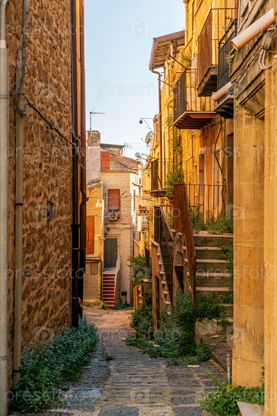 Пиетраперция, Сицилия, Италия Исторический центр города Узкая улица с домами Летний солнечный день