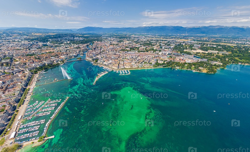 Женева, Швейцария. Фонтан Дже-Дэу. Женевское озеро. Панорама летом. Вид с воздуха