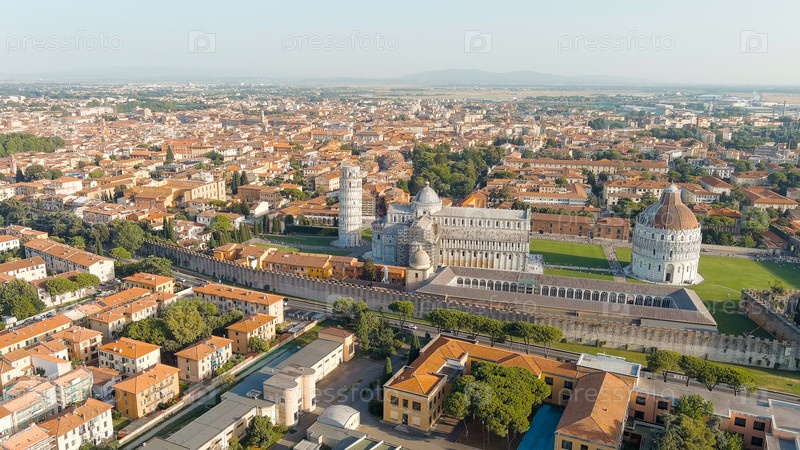 Пиза, Италия. знаменитая наклонная башня и пизанский собор в Пьяцце-дей-Мираколи. лето. вечерние часы, взгляд с воздуха