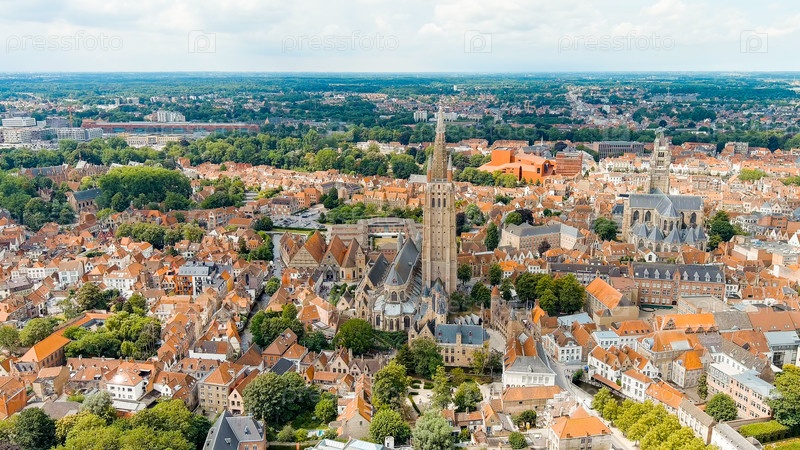 Брюгге, Бельгия Церковь Богоматери - готическая церковь XIII века Панорама на центр города с воздуха Облачная погода, летний день, Aerial View