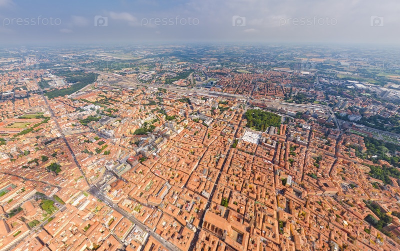 Болонья, Италия Исторический центр Панорама города в летний день Солнечная погода Вид с воздуха