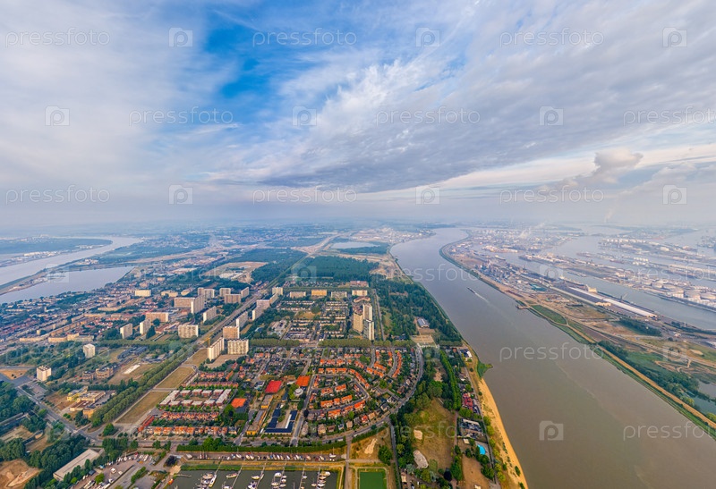 Антверпен, Бельгия. Панорама города. Река Шелда (Эскаут). Летнее утро. Вид с воздуха
