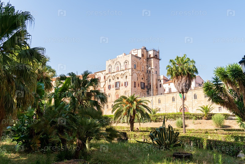 Палермо, Сицилия, Италия.Палаццо Норманни - Большой дворец 9-го века с неоклассическим фасадом, знаменитой часовней и изысканными королевскими апартаментами.Солнечный летний день