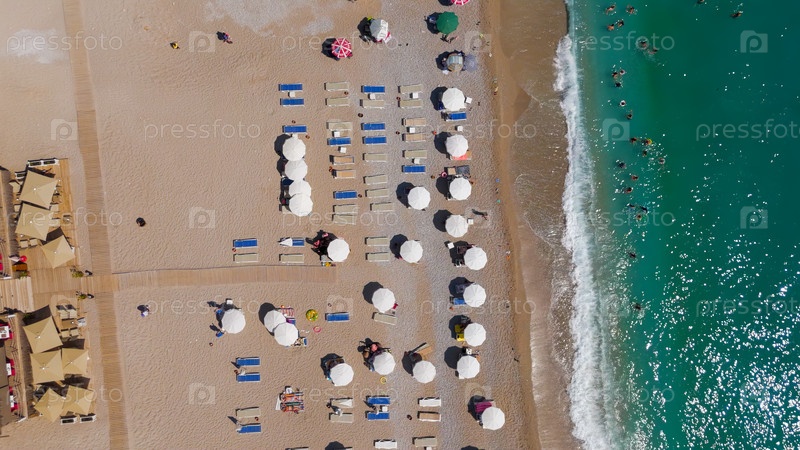 Вид с воздуха на пляж Олудениз, люди ходят, кафе с зонтиками, шезлонги на берегу и голубое море с мягкими волнами, лето