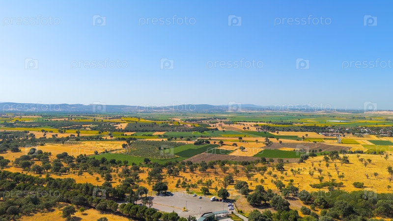 Тевфикие, Турция.Окружающие древний город Тройские сельскохозяйственные поля и Дарданелльский пролив в далеком расстоянии в летний день.Вид с воздуха