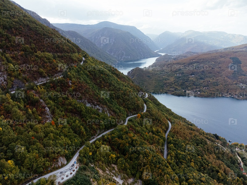 Вид с воздуха плотины Перукац на реке Дрине недалеко от национального парка Тара в Сербии, окруженный осенним лесом
