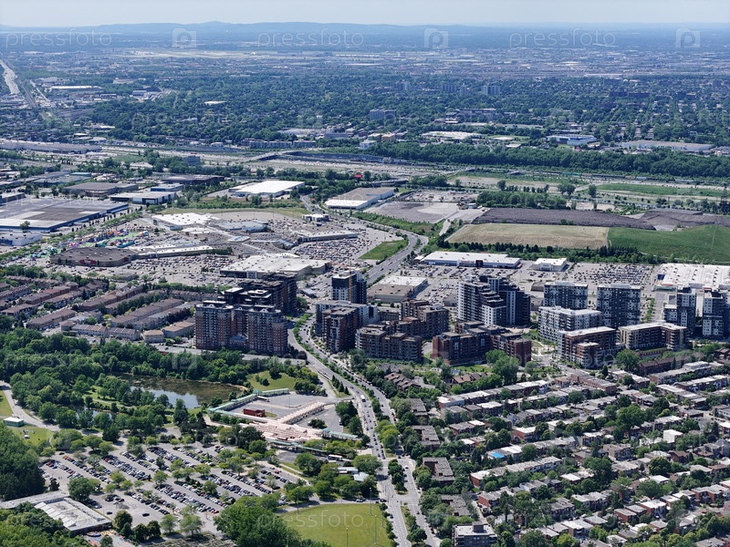 Вид с воздуха на канал Верден и Ла-Кине с горизонтом центра Монреаля, Квебек, Канада. g
