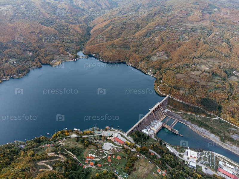 Вид с воздуха плотины Перукац на реке Дрине недалеко от национального парка Тара в Сербии, окруженный осенним лесом