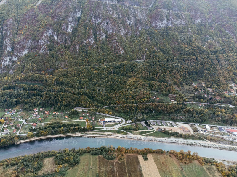 Вид с воздуха извилистой горной дороги рядом с рекой в осенней долине. g