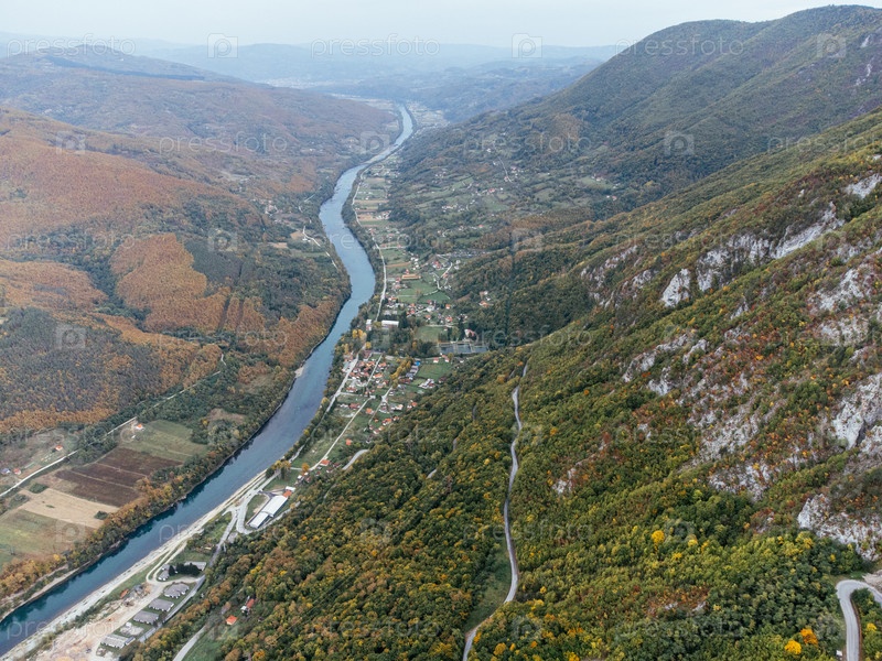 Вид с воздуха плотины Перукац на реке Дрине недалеко от национального парка Тара в Сербии, окруженный осенним лесом