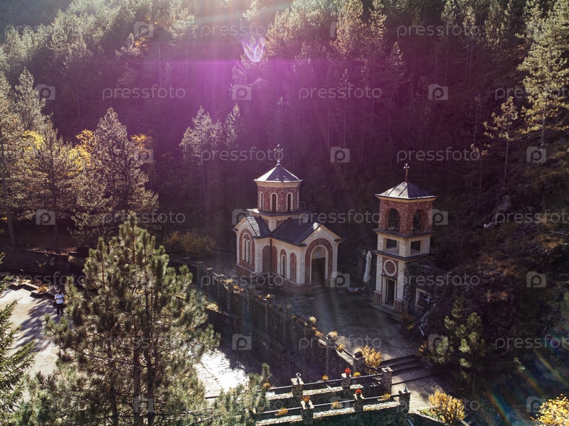 Православная церковь в горах Тара лес с солнечным светом и каменной колокольницей в Сербии
