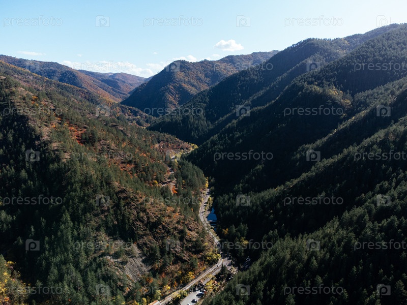 Вид с воздуха на горы Тара в Сербии с осенним лесом, сельской долиной и утренним туманом