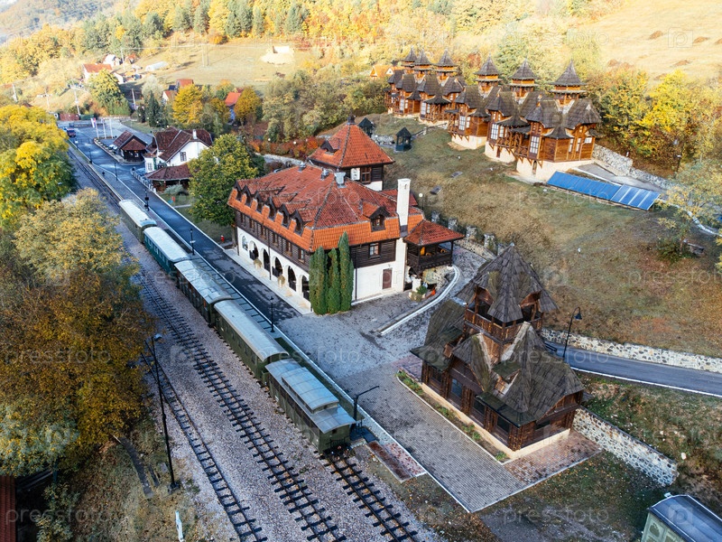 Вид с воздуха деревянной железнодорожной станции и старинных вагонов среди осенних листьев в Таре, Сербия. g