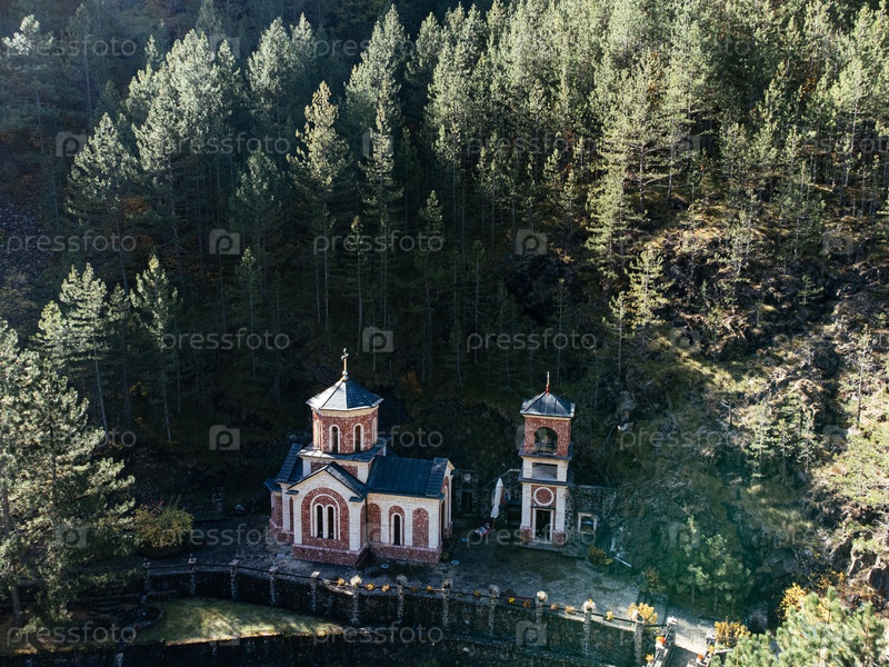 Православная церковь в горах Тара лес с солнечным светом и каменной колокольницей в Сербии