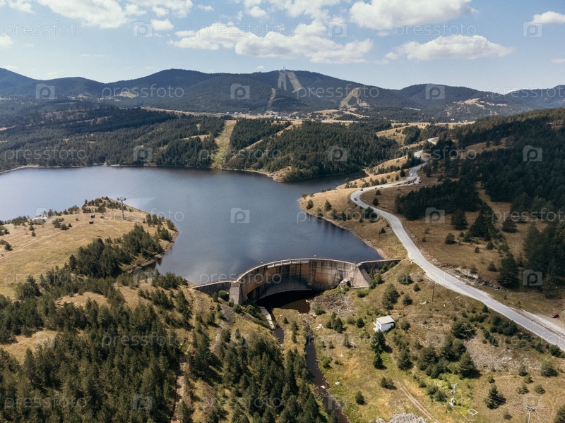 Вид с воздуха плотины и озера Златибор в Сербии, окруженный лесистыми холмами и извилистыми дорогами