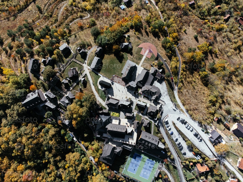 Вид с воздуха деревни Кустурица в горах Златибора, Сербия в солнечный осенний день