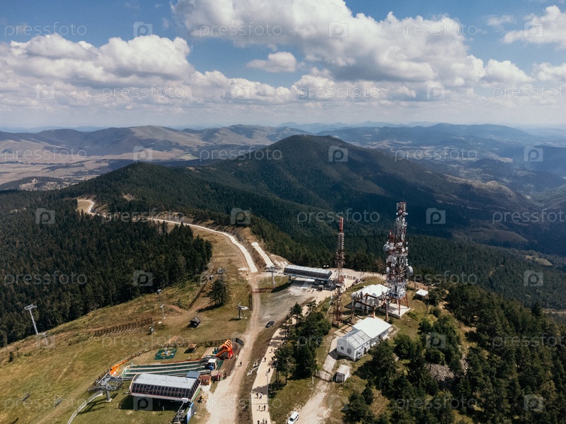 Вид с воздуха на высокогорье Златибор, деревню с лесистыми холмами и разбросанными домами летом