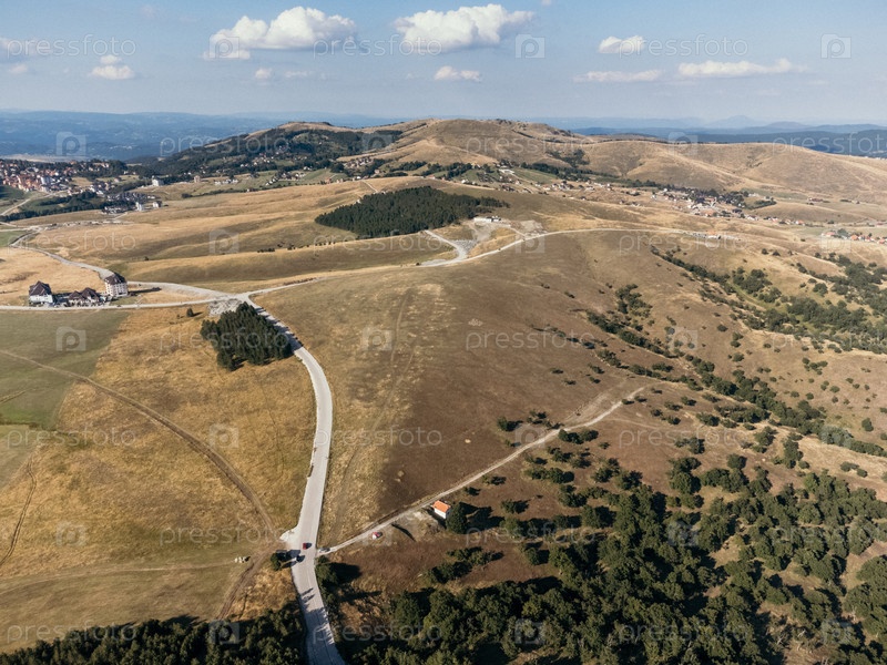 Вид с воздуха на высокогорье Златибор, деревню с лесистыми холмами и разбросанными домами летом