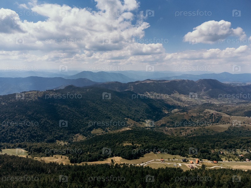 Вид с воздуха на высокогорье Златибор, деревню с лесистыми холмами и разбросанными домами летом