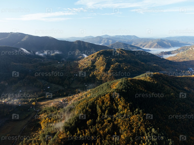 Вид с воздуха на горы Тара в Сербии с осенним лесом, сельской долиной и утренним туманом