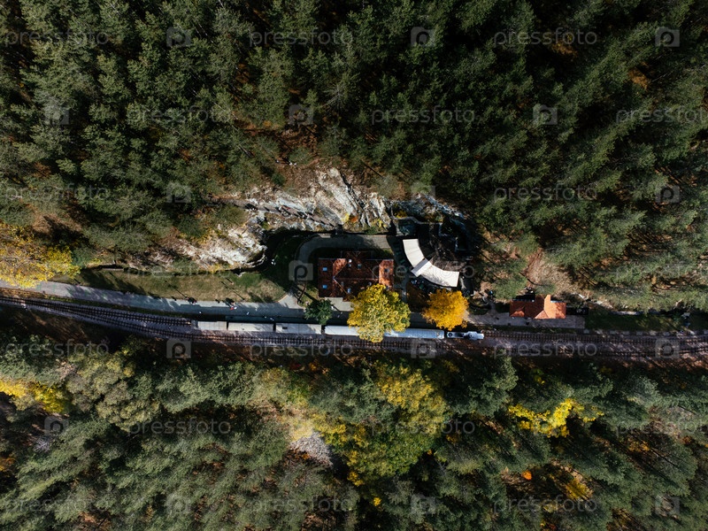 Вид с воздуха деревянной железнодорожной станции и старинных вагонов среди осенних листьев в Таре, Сербия. g